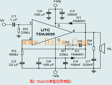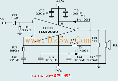 TDA2030具有負載泄放電壓反沖保護電路,如果電源電壓峰值電壓40V的話,那么在5腳與電源之間必須插入LC濾波器,以保證5腳上的脈沖串維持在規(guī)定的幅度內。
