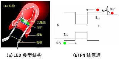 發(fā)光二極管(LED)是一種能把電能轉(zhuǎn)化為光能的固體器件,它的結(jié)構(gòu)主要由PN結(jié)芯片、電極和光學(xué)系統(tǒng)等組成。LED的基本的工作原理是一個(gè)電光轉(zhuǎn)換過程,當(dāng)一個(gè)正向偏壓施加于PN結(jié)兩端,由于PN結(jié)勢(shì)壘的降低,P區(qū)的正電荷將向N區(qū)擴(kuò)散,N區(qū)的電子也向P區(qū)擴(kuò)散,同時(shí)在兩個(gè)區(qū)域形成非平衡電荷的積累。由于電流注入產(chǎn)生的少數(shù)載流子是不穩(wěn)定的,對(duì)于PN結(jié)系統(tǒng),注入到價(jià)帶中的非平衡空穴要與導(dǎo)帶中的電子復(fù)合,其中多余的能量將以光的形式向外輻射,電子和空穴的能量差越大,產(chǎn)生的光子的能量就越高。能量級(jí)差大小不同,產(chǎn)生光的頻率和波長(zhǎng)就不同,相應(yīng)的光的顏色就不同。