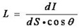 光源發(fā)光表面上某一點(diǎn)處的亮度是該面元dS在給定方向上的發(fā)光強(qiáng)度除以該面元在垂直于給定方向的平面上的正投影面積之商,即: