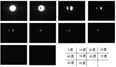 如圖11所示,我們利用表觀光源測(cè)試系統(tǒng)對(duì)白光LED進(jìn)行了測(cè)試,上述9幅圖是在0度(正對(duì))和90度方向上間隔10度拍攝得到的表觀光源像。理論上我們應(yīng)該按各個(gè)方向進(jìn)行光安全的測(cè)試評(píng)價(jià),但是本文為簡(jiǎn)單起見只對(duì)0度方向的情況進(jìn)行測(cè)試評(píng)價(jià)(因?yàn)樵摲较蚬廨敵鲎顝?qiáng)),其它角度可以此類推。0度方向表觀光源大小為直徑2.5cm的圓斑。
