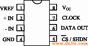 腳1為基準(zhǔn)電壓輸入端;腳2為正極性模擬信號輸入端;腳3為負(fù)極性模擬信號輸入端;腳4為公共端;腳5為片選端,CS由高電平跳變到低電平將復(fù)位內(nèi)部計數(shù)器,并控制和使能DATA OUT端和CLOCK端,CS由低電平跳變到高電平將在一個設(shè)置時間內(nèi)禁止CLOCK;腳6為A/D轉(zhuǎn)換結(jié)果三態(tài)輸出端(數(shù)字信號輸出端),在CS為高電平時,該腳處于高阻狀態(tài),當(dāng)CS為低電平時,該腳由前一次轉(zhuǎn)換結(jié)果的MSB值置成相應(yīng)的邏輯電平;腳7為時鐘信號輸入端;腳8為電源正極性端。