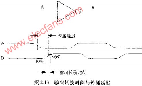 理論上的數(shù)字邏輯設(shè)計(jì)重點(diǎn)關(guān)注的是邏輯門電路的傳播延遲。相比之下,高頻電子工程中的許多實(shí)際的問題通常只取決于一個(gè)更細(xì)微的指標(biāo):最小輸出轉(zhuǎn)換時(shí)間。圖2.13舉例說明了這一差別。