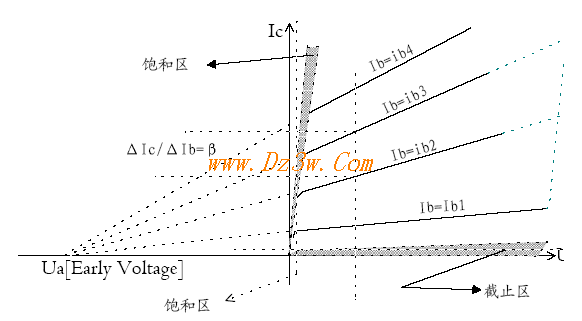 共發(fā)射極電流放大系數(shù)B=△Ic/△Ib 。從圖中可以看出,當(dāng) Ib 減小到一定值時(shí),不管 Uce 如何變化, Ic 趨向一個(gè)幾乎不變的常數(shù),這時(shí)定義 BJT 進(jìn)入了截止?fàn)顟B(tài),水平陰影區(qū)域表示 BJT 的截止區(qū)。當(dāng) Uce 減小到一定值時(shí),不管 Ib 如何變化, Ic 都不會(huì)按比例增加, l 往往這時(shí)的 Uce 接近或小于 Ute ] ,這時(shí)定義 BJT 進(jìn)入了飽和狀態(tài)。這兩種狀態(tài)在線性電路中都是有害的,它會(huì)破壞信號(hào)的完整性,因此應(yīng)該設(shè)計(jì)正確的偏置,使 BJT 不進(jìn)入這兩種狀態(tài)。在垂直和水平陰影兩區(qū)之間的區(qū)域稱為放大區(qū),在這個(gè)區(qū)域中, Ic 正比于 Ib 。只要使 O < Ube< Ube 。[門限電壓],就可以使 I 。= O 。這時(shí)的 Ib =-Icb 。, Ic=Ict 。Ib=-Ict 。這條曲線是截止區(qū)與放大區(qū)之間的分界線。當(dāng)Ib=O 時(shí) Ie 不一定等于。,此時(shí)的 Ie 記為 Iec 。,稱為 CE 穿透電流,硅管的穿透電流往往小于 1 微安,鍺管的為 0 . 5-1 . 5IllA ,且會(huì)隨溫度的增加而增加。另外,當(dāng) Uce 增加到一定值時(shí), Ic 也突然增加,不受 Ib 的控制,這是因?yàn)?CE 極間發(fā)生擊穿,擊穿電壓的大小 與流過集電極的電流大小有關(guān)。 CE 擊穿很容易損壞 BJT ,因此在實(shí)際電路中也要同時(shí)考慮 Uce 的電壓范圍。