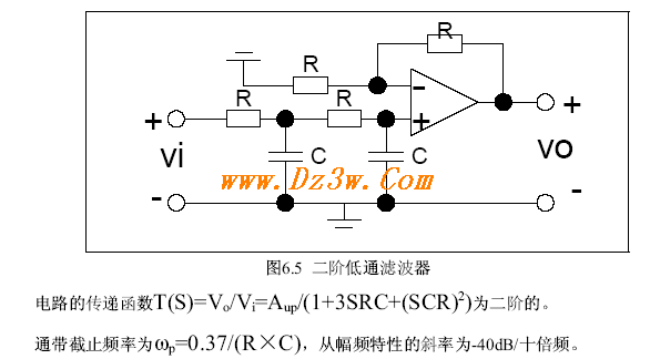 一階低通濾波器的衰減斜率為一2OdB/十倍頻,選擇性較差。采用如圖6.5的電路則可以得到