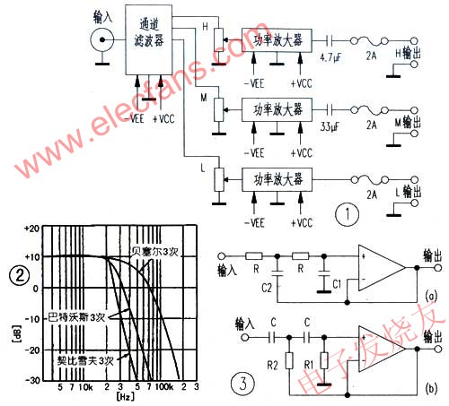 在前置放大器之后用有源濾波器分割頻帶,各頻段有自己的功率放大器和揚(yáng)聲器,各頻段的電平在各功率放大器之前用電位器調(diào)整。這種方式的優(yōu)點(diǎn)是顯而易見(jiàn) 的,它取消了前述 LC 網(wǎng)絡(luò),又能有效地利用各個(gè)揚(yáng)聲器的效率;同時(shí),也降低了對(duì)功率放大器的頻率要求,輸出功率也可以小一些;這種結(jié)構(gòu)示于圖 1 ,其關(guān)鍵電路是有源濾波器。