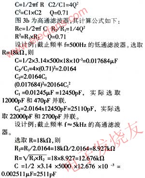 使用運(yùn)算放大器的有源濾波器可以取消電感元件,并能獲得電壓或電流增益。按濾波器截止特性不同可分為貝塞爾型、契比雪夫型和巴特沃斯型.其特性曲線見(jiàn) 圖 2 ,主要表現(xiàn)在截止頻率附近.貝塞爾型下降緩慢,契比雪夫型下降陡峭,而巴特沃斯型界于二者之間。截止特性通常用 l 倍頻程的衰減量為多少分貝來(lái)表示,二階濾波器的每倍頻程衰減量為 12 分貝,三階濾波器為 18 分貝.圖 3 是標(biāo)準(zhǔn)的巴特沃斯二階有源濾波器。圖 3a 為低通濾波器,其計(jì)算公式如下: