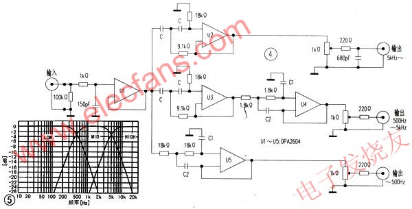 圖 4 是一款音頻用 12 分貝三通道電子分頻器的原理圖。選用多通道前級(jí)分頻比在功率放大器后分頻更能獲得良好的音質(zhì)。三通道分頻的頻率范圍分別是低頻~ 500Hz :
