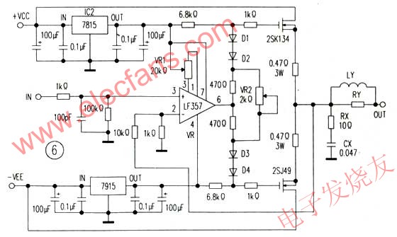 三路濾波器的輸出信號(hào)分別接至相同的三個(gè)功率放大器,其電路示于圖 6 。首先用輸入級(jí)為 FET 的運(yùn)放 LF357 作電流緩沖,末級(jí)功放管采用高頻特性好的 MOSFET ,偏置電路用二極管和電阻構(gòu)成.利用半可變電阻 VR2 設(shè)置靜態(tài)電流,靜態(tài)電流的測(cè)定可在無(wú)信號(hào)時(shí)測(cè)量源級(jí)電阻 (0.47 Ω ) 兩端電壓。然后利用公式 I="U" / R 算出。末級(jí)負(fù)反饋從 MOSFET 的源極加到運(yùn)放的反相端。由于用作驅(qū)動(dòng)的運(yùn)算放大器的電源電壓不能過(guò)高,限制了功放的最大輸出。如運(yùn)放電源電壓為± 15V ,驅(qū)動(dòng)級(jí)最大輸出電壓為土 12V=24V ,揚(yáng)聲器阻抗 RL="8" Ω,則末級(jí)最大輸出功率 P="Vcc" × (VCC / 8RL)=24 × 24 / 64=9W 。這個(gè)功率似乎偏小,但實(shí)際上這只是一個(gè)頻段的輸出功率,加上另外兩個(gè)頻段的輸出功率,已完全適用。