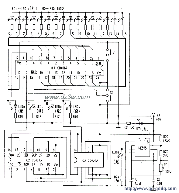 電源從XJ插入,電源指示發(fā)光管LED亮,振蕩電路開始工作,輸出計數(shù)脈沖。調(diào)節(jié)RP,使振蕩頻率最低,此時LED0約每秒閃亮一次,計數(shù)器開始計數(shù),發(fā)光管LEDD、LEDC、LEDB、LEDA遵循842l碼的原則發(fā)光,計數(shù)器將編碼輸送到CD4067數(shù)控端,再根據(jù)編碼順序,依次接通CD4067的0~15通道,使LED0~LEDl5的16只發(fā)光二極管依次發(fā)光,每只發(fā)光管發(fā)光時間受計數(shù)脈沖控制。由于計數(shù)是連續(xù)進(jìn)行的,所以CD4067的16個通道依次輪流導(dǎo)通,且周而復(fù)始,整個電路工作原理及功能可一目了然。